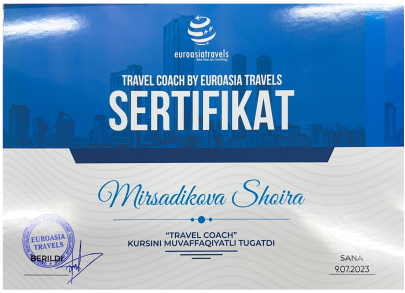 Мирсодикова Шоирахон является основателем туристического агентства “KabirTur”. В 1999 году окончила Ташкентский банковский колледж, в 2007 году окончила университет по имени Мирзо Улугбека факультет истории. С 2001 по 2008 год работала в Академии государства и общества при президенте, с 2008 по 2010 год работала на телерадиоканале Узбекистана, а с 2017 по 2019 год работала на телеканале (ZO’R TV) с 2019 года является учредителем канала youtube с (MIRSODIKOVA BILAN)
